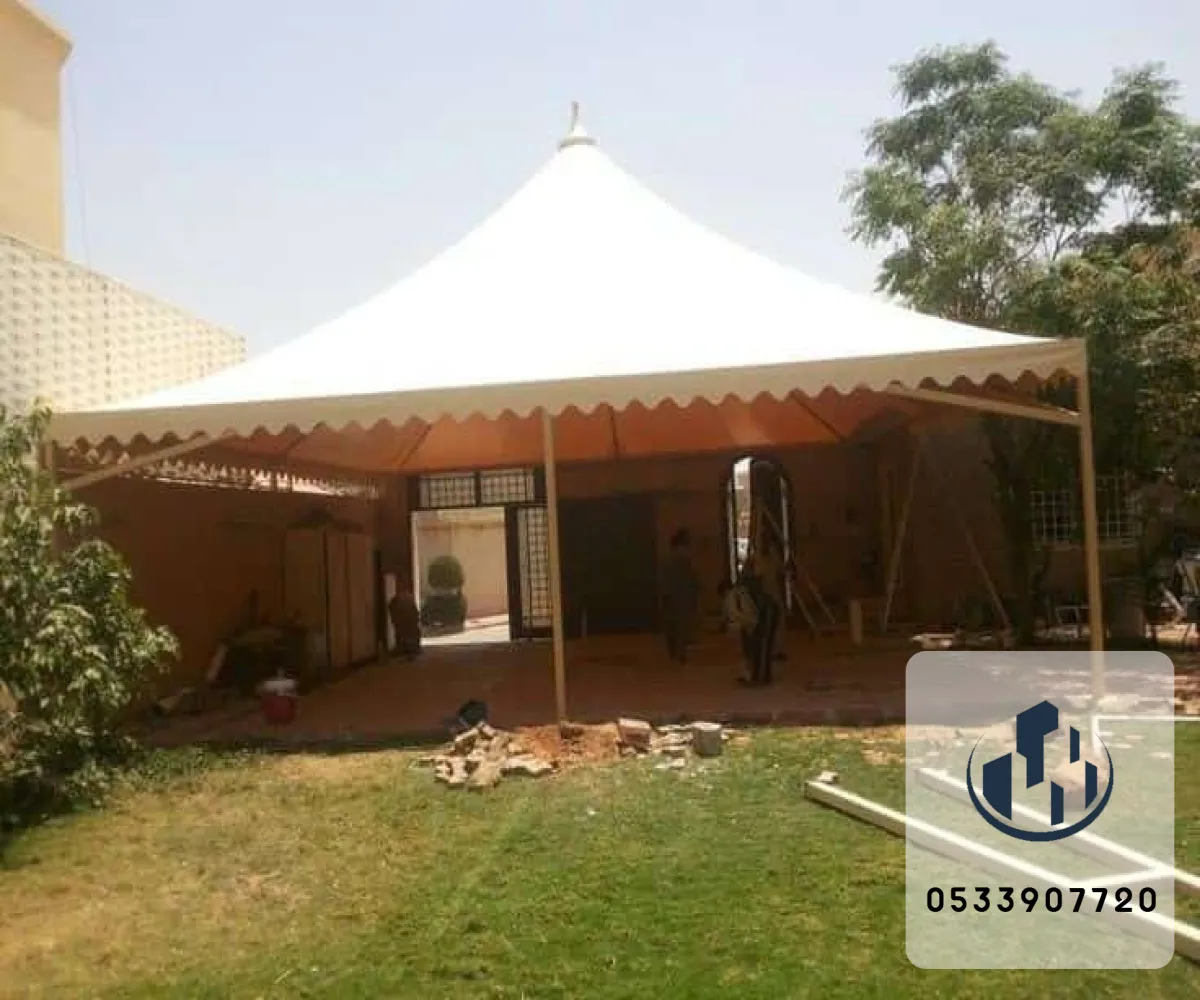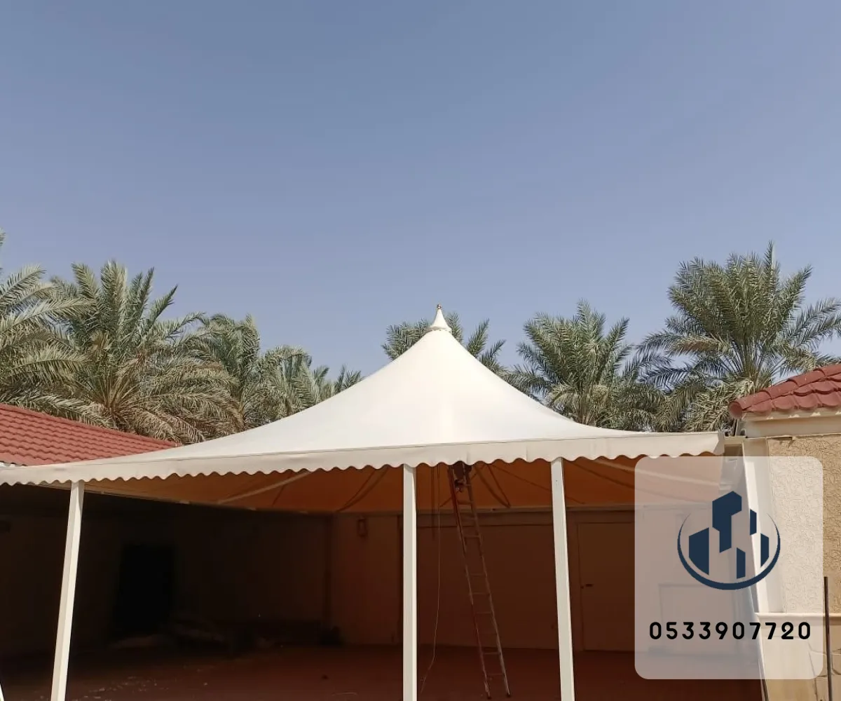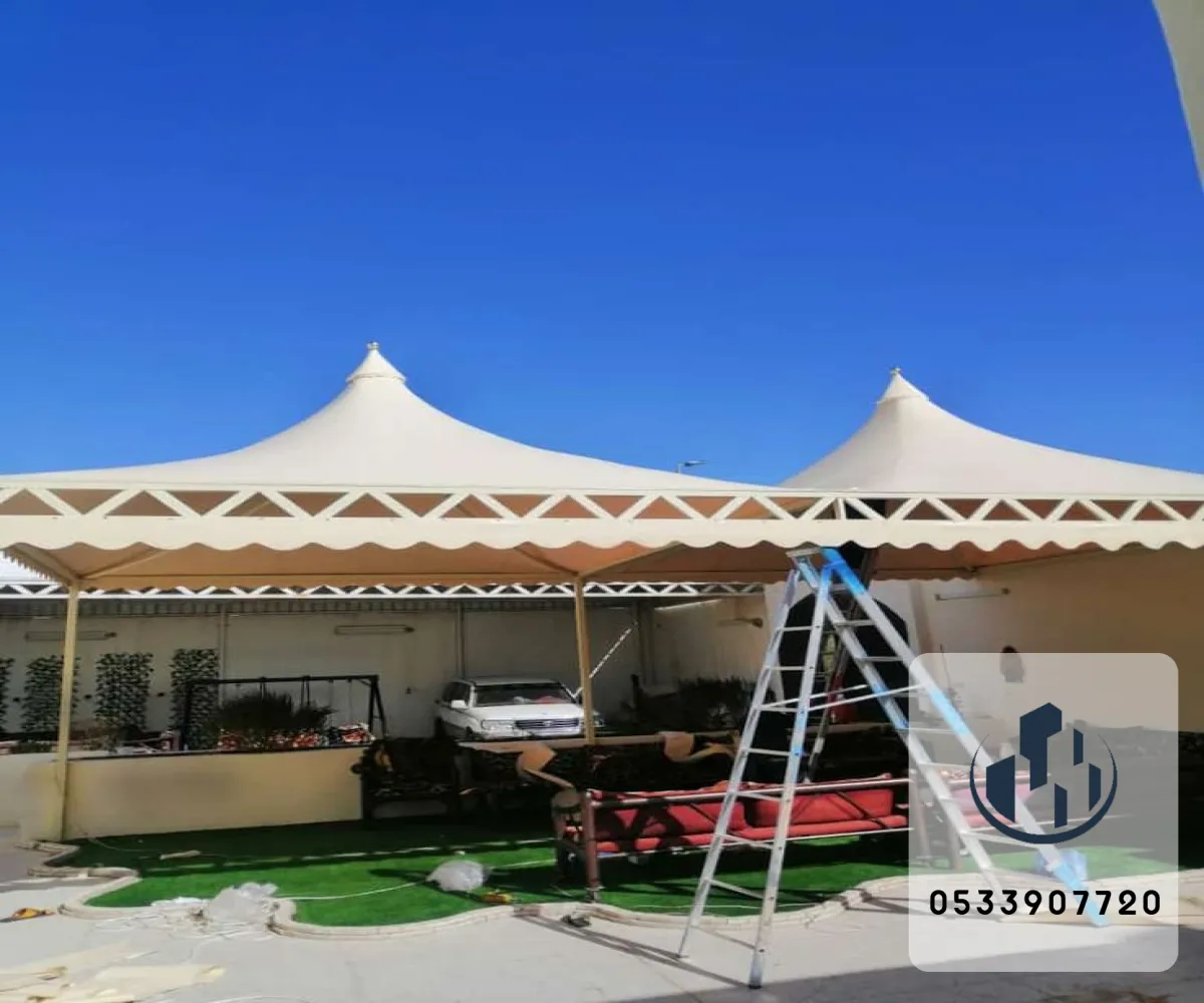 نوفّر تنفيذ مظلات هرمية بمقاسات وألوان متعددة حسب الطلب، مع تركيب احترافي يضمن المتانة والجمال.
